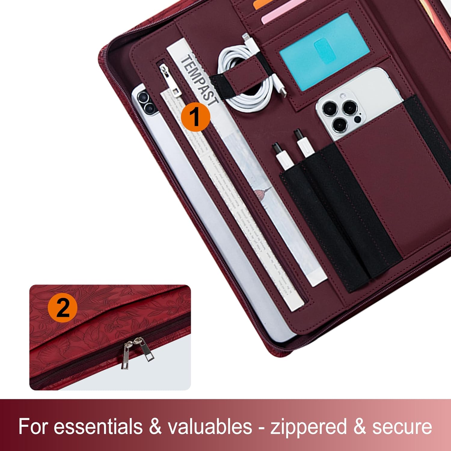 Elevate your professional style with our Elegant Multi-Function Leather Portfolio Organizer. Designed to meet the needs of busy professionals, entrepreneurs, and students, this portfolio combines the functionality of a business organizer with the sophistication of premium leather craftsmanship. Inside, you’ll find ample space to organize all your essentials. There are four card slots to hold your business cards or credit cards, a wire holder for your charging cables, and dedicated pen holders for two pens, ensuring you’re always ready to take notes. The tablet holder offers a safe space to store your device, while the phone pocket keeps your smartphone accessible but secure. Whether you're writing in your A4-sized notepad pocket, or organizing your documents in the zipper pocket, this portfolio provides easy access to everything you need to stay organized. Perfect for meetings, conferences, or travel, it’s an essential item that will help you stay professional and prepared no matter where you go.